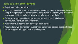 1Tindakan preventif yakni usaha menjauhkan diri dari bahaya sihir sebelum terjadi. 3- Harus menjadi keras hatinya dari perasan kasihan kepada mangsa. Sifat yang ada kepada Penyihir 1- Mempersembahkan hidup dan matinya untuk syaitan serta semua milik harta dan keturunan untuk syaitan.